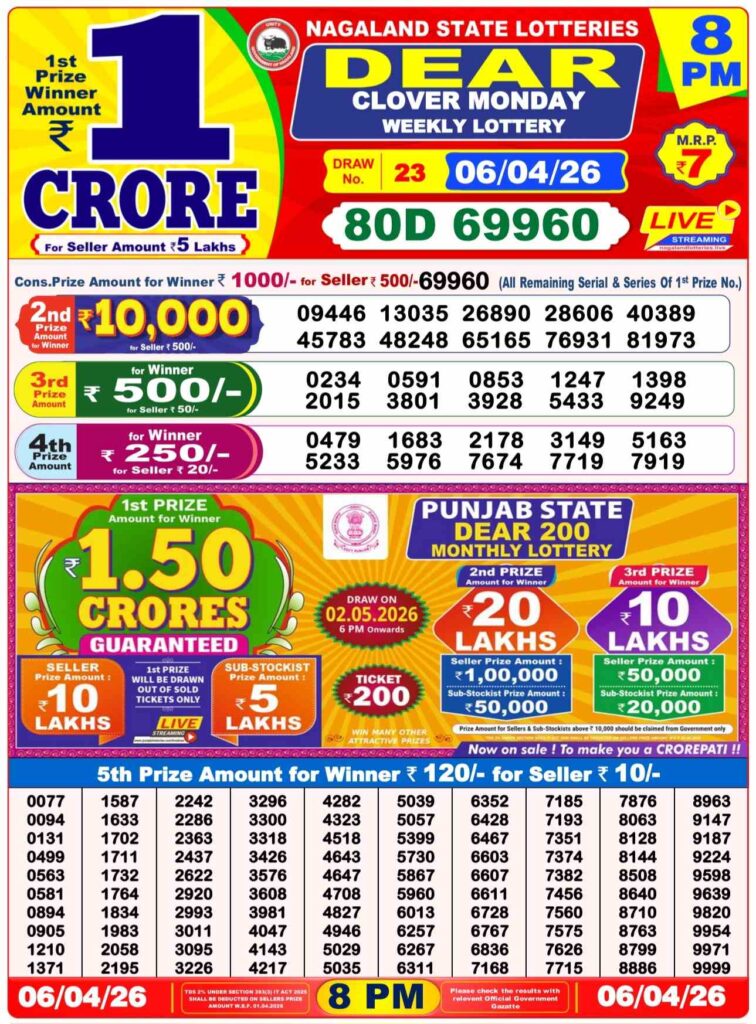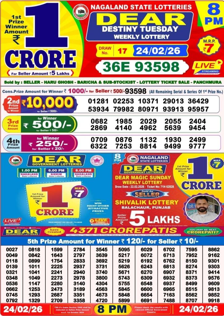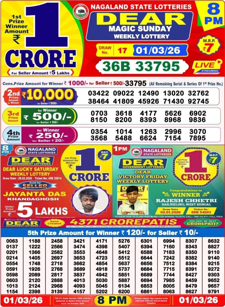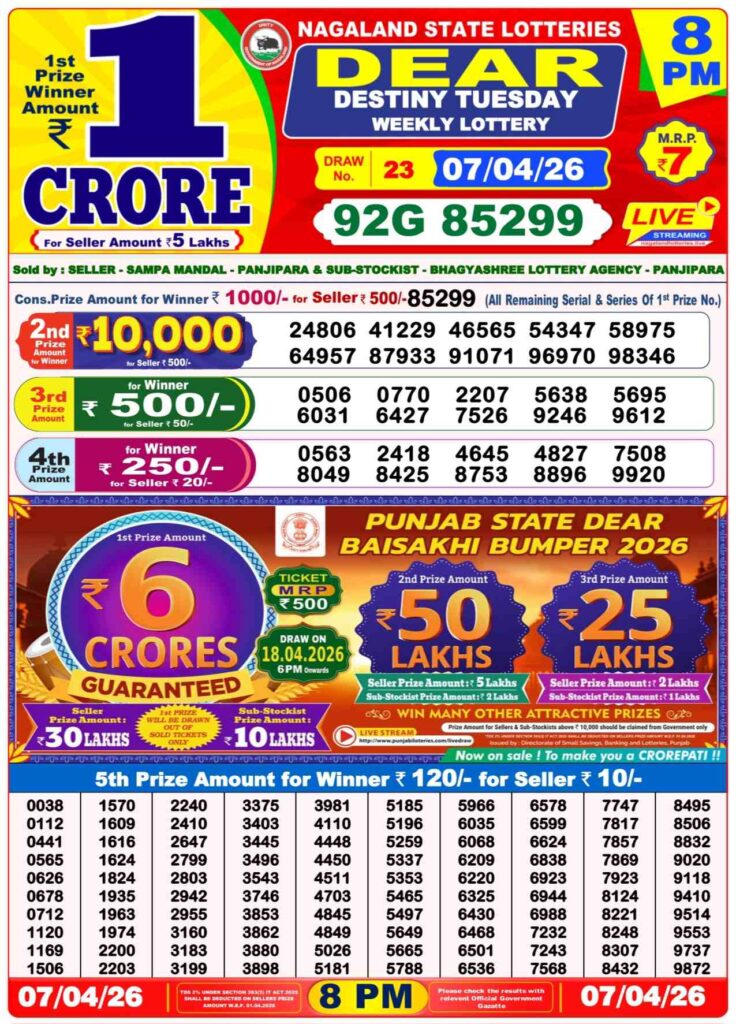 Nagaland State Lottery 8pm Result also called Lottery Sambad Night Results. This Nagaland State Lottery 8 pm ticket cost is 6 Rs. You can also be a Lakhpati by buying Nagaland State Lottery 8 pm ticket.