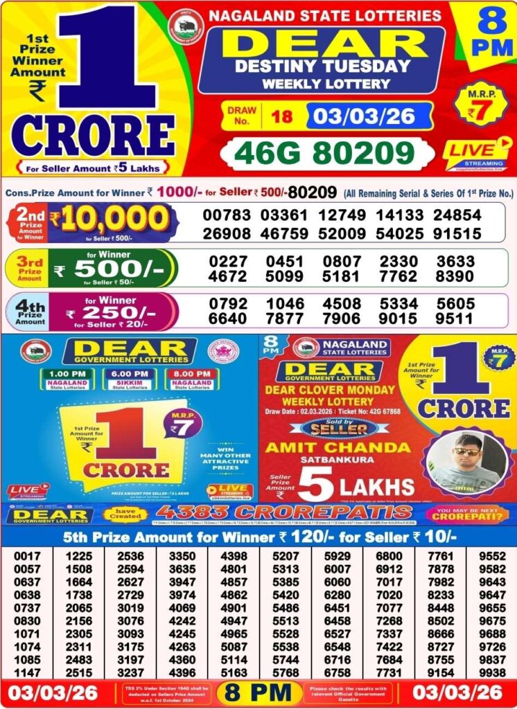 Nagaland State Lottery 8pm is also called Lottery Sambad Night. Nagaland State Lottery Night Result You can browse and download this site Technowanted from 8pm to 8.15 after 8 pm.