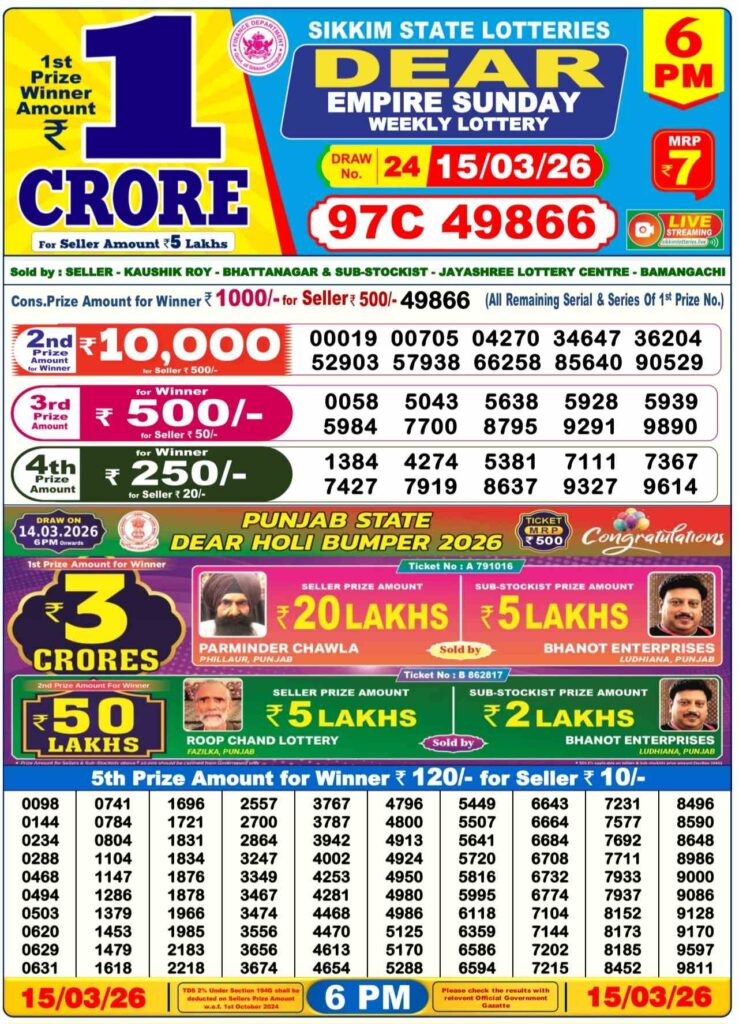 Sikkim State Lottery Result is released each day at 1 pm. Sikkim State Lottery Results 1 PM is also referred to in the form of Dhankesari Lottery Sambad. You can watch the Lottery Sambad draw live on Youtube.com.