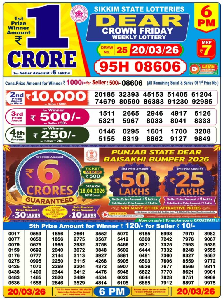 Lottery Sambad 6 pm means West Bengal State Lottery result. The Lottery Sambad Result you will be able to view on this website from 6 pm and 6.15 am. This is the only significant lottery for the West Bengal State Lottery. It is possible to look up or download its Lottery Sambad Results in PDF format. This Pdf Lottery Sambad Result on Google Drive. There’s an additional channel on youtube.com named Dear Lottery Result of West Bengal State Lottery from which you can also view West Bengal State Lottery Live Drow. All you need to do is visit Youtube.com and type in Dear Lottery Result in the search box.