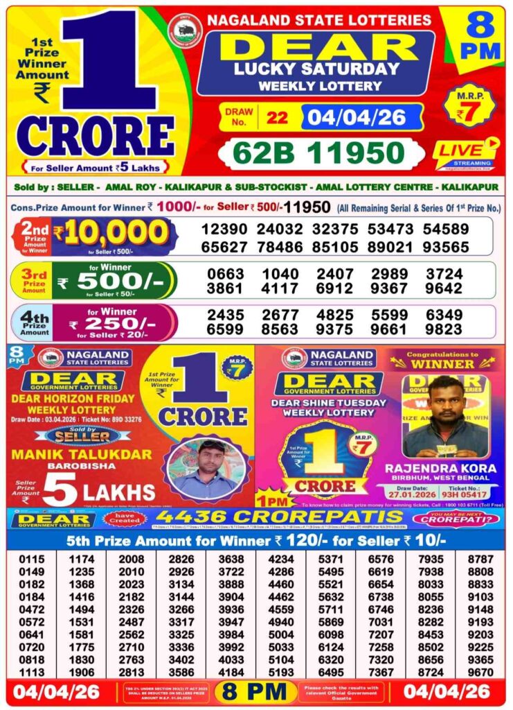 Nagaland State Dear Hooghly Morning Lottery Sambad Result 24.6.4044: Are you Searching for Nagaland State Dear Hooghly Morning 24.6.4044 Lottery Sambad Result?. If so, you’ve come to the right website. Below you will see results for the Nagaland State’s Dear Hooghly Morning Lottery Sambad Results 24.6.4044. Nagaland State Lotteries are used to announce the live Dear Hooghly Morning Lottery Results 24.6.4044 Dear Morning live starting at 2 pm every day. The the official Nagaland State Dear Hooghly Early Morning Lottery Results will be posted at 2:05 pm via their official site. We are updating our live Dear Hooghly Morning Lottery Result at 2pm. The people are asked to check this page to know the latest results. Today Nagaland Dear Hooghly Morning Lottery Results. Saturday Lottery Results 24.6.4044. Check the Above Dear Hooghly Morning Lottery Result 24.6.4044. Kolkata ff