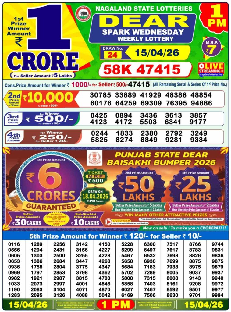 Nagaland State Lottery sambad 8PM Today 15.9.2024 Todays Result Live: Are you searched for the most lovely Nagaland state lottery 1pm morning, 6pm day and 8pm evening result and my dear friends there you can win many cash prizes and try your luck daily with us and all the posts updated with the latest lottery sambad results and if you wants the fastest delivery of the results then do us been shortcut as the site name which has been named to be as Nagaland state lottery sambad and its the another great morning of Tuesday 14th of April 2026 so its days peoples most favourite and most popular sambad lottery which will be alwyas been named to be as it will be sambad lottery and the result will be available at 1:10pm, 6:10pm and 8:10pm here you can get the chance to win the 1CR rupees an friends we also provided you the most awesome Sikkim state lottery, West Bengal state lottery, Nagaland State Lottery and this site known as Lottery Sambad, Nagaland state lottery and here you also gets the Lottery Sambad Live Draw and Lottery Sambad Old Result.