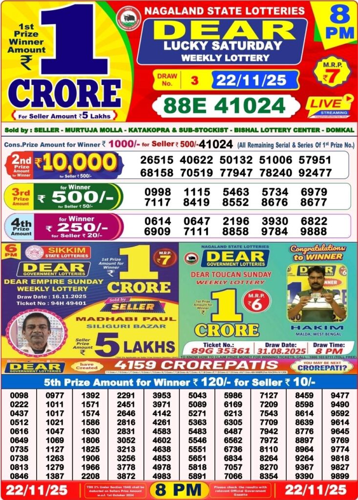 Nagaland State Lottery 8PM Today 23.11.2025 Todays Result Live: There you are in this special post is about for the most lovely Nagaland State Lottery 8pm evening reuslt and friends you alwyas been updated with the peopels most favourite and deatiled is about for the most lovely lottery sambad results and firends there if you needs the fastest delivery of the results then you can do su been created shortcut as the site name which has been named as Nagaland state lottery sambad and it sthe another lovely morning of Tuesday 16th of September 2025 its days peopels one of the most lovely smabad lottery being proudly known to be as Nagaland state lotteries DEAR PARROT EVENING and the result will be available at 8:10pm here you can get the chance to win the 1CR rupees an friends we also provided you the most awesome Sikkim state lottery, West Bengal state lottery, Nagaland State Lottery and this site known as Lottery Sambad, Nagaland state lottery and here you also gets the Lottery Sambad Live Draw and Lottery Sambad Old Result.
